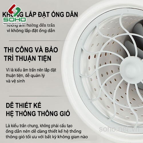 - Dòng quạt không ống gió nên không ảnh hưởng đến trần
