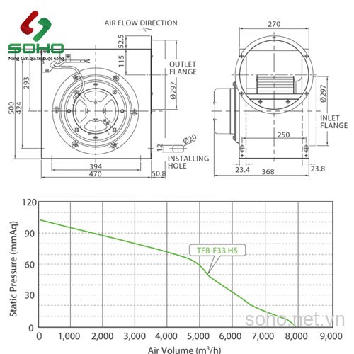 TFB-F33HS có kích thước khá nhỏ gọn. Tuy nhiên, nó lại tạo ra một lưu lượng khí rất cao: 7.920-8.800 m3/h. Cùng với đó, áp suất tĩnh của chúng đạt 101-115 mmAq. Giúp việc hút mùi, hút bụi,.. diễn ra nhanh chóng và sạch hơn