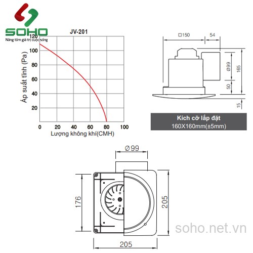 JV-201 có thiết kế mặt gió hình vuông, kích thước khá nhỏ: 205×205 mm, chỉ bằng 1 gang tay người lớn. Kích thước này khá tiện dụng để được lắp đặt cho các không gian nhỏ. Không làm ảnh hưởng đến bố cục của tổng thể căn phòng.